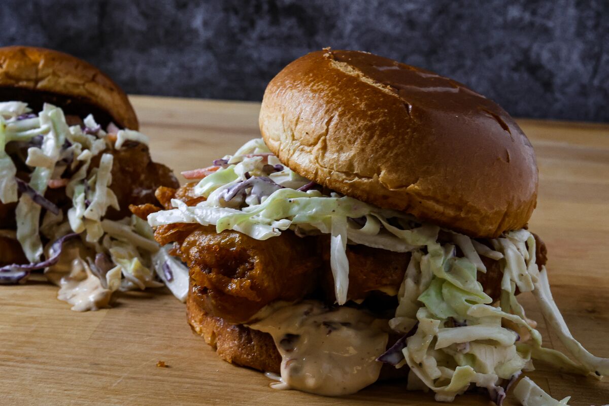 The Southern Style Chipotle Chicken Sandwich starts with a crispy, golden-brown fried chicken thigh, seasoned with salt and pepper and dredged in a wet batter made with flour, seltzer water, salt, pepper, onion powder, garlic powder, paprika and cayenne pepper. Topped with coleslaw and a chipotle chili mayonnaise that adds a smoky, slightly spicy flavor to the chicken sandwich that is balanced out by the cool and creamy coleslaw.