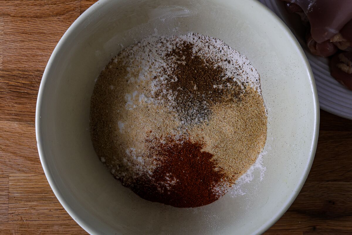 - Add the remaining salt and pepper together with the onion powder, garlic powder, paprika, and cayenne pepper.